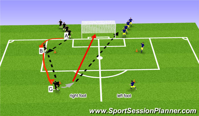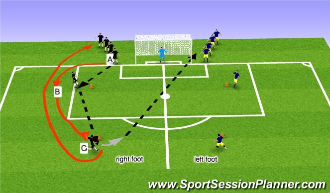 2. The first player in line (player A) passes to player B on the first cone they then follow their pass, the player must recieve the ball turn and pass to Player C on the the shooting cone, and then follow their pass.