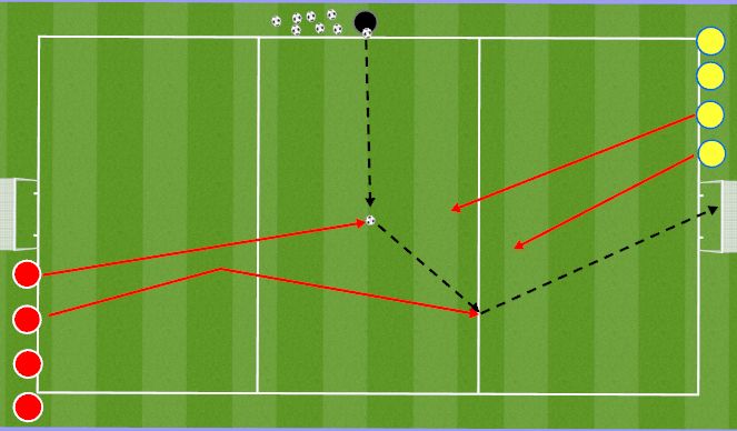 The coach numbers players before the game - ideally equally matched. To begin, the coach calls out a number(s) and kicks the ball into the center of the playing area. The corresponding players from each team run to the ball and go into a 1v1/2v2 and play to goal or until the ball goes out of play. Coaches can call a 1v1/2v2 (example: "Number 2 and 3!" - players 2 & 3 on both teams run to the ball). The teams keep their score.