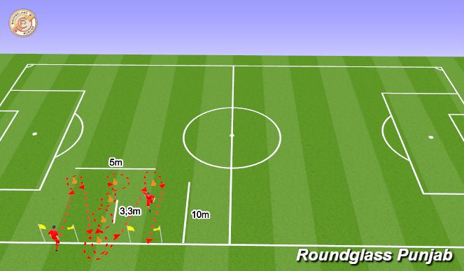 • Player executes a fast run towards the cone and then moves quickly around it, thereafter has to sprint back to the line of the 4 cones and slalom between them as quickly and agile as possible. At the top has to redo the same movement but vise-versa and by the time player reaches again the initial cone, sprints to the very top right cone and eventually finalizes his try by moving around the cone and sprinting over the termination time gate