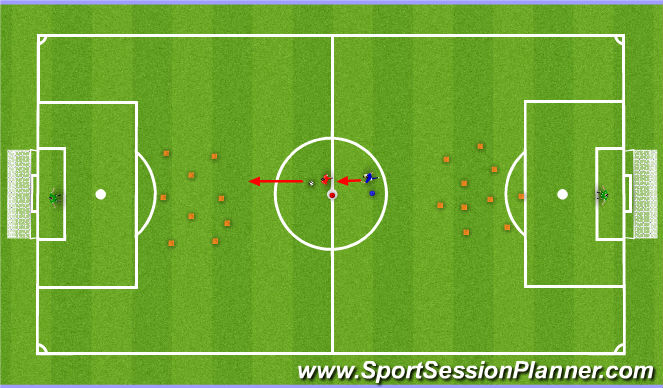 On the coach's signal, attacker dribbles towards the goal and tries to score, defender tries to recover the ball. If the attacker touches any of the cones with the ball, he needs to freeze and count to 3. During that period the defender steals the ball and attacks the opposite direction. The game continues until there is a goal or if the ball goes out of play.