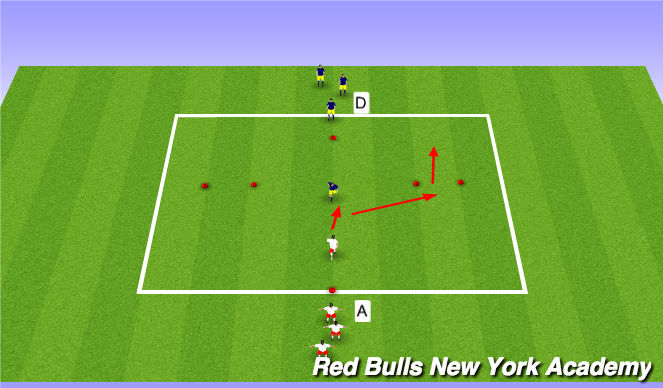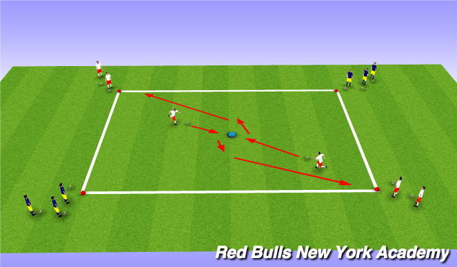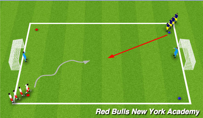 Restarts are always made from the coach who has as many balls as possible around him, if the ball goes out a new game ball is immediately played in. The game is continuous (no stoppages for throw ins, corners etc.) until the players need a water break or the coach runs out of balls.