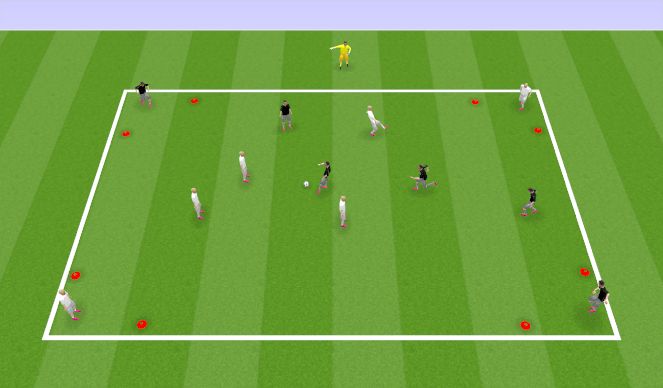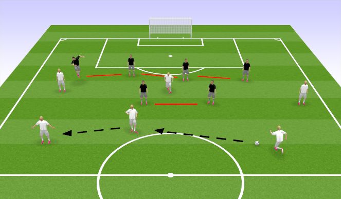 Follow on from last week. Back line and 2 midfielders shift across keeping distances. Attacking team (white shirts) shift ball one side to the other. If a player sees the gap in cones for the opportunity for a through ball, attacking player goes for it and we find the pass to attack the goal. If the coach blows the whistle, it's a free kick where the ball is to the defending team (black shirts) and they play quickly to score on half way line in mini goals.