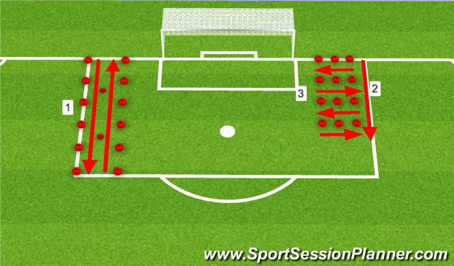 3) Finally the goalkeeper can practice and warm up the side stepping while will be used alot during this session. The goalkeeper simply sidesteps between the rowns of cones until he reaches the end. this can be done forwards and backwards.