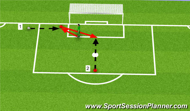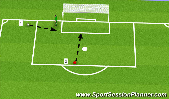 This practice can then be flipped on its head, where (1) provides a straight catch and (2) provides an angled shot. Using an angled shot is best practice as it gives one side of near side and one far side for the goalkeeper to cover.