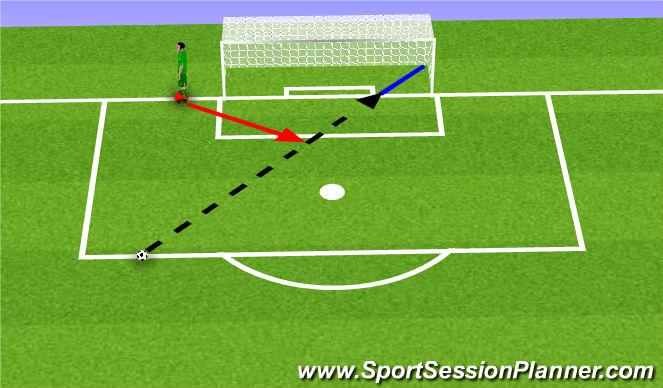 The shot should be aimed at the back corner of the net (as shown in the picture by the blue continuation line) as this is more realistic of a strikers aim.