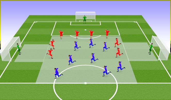 Dos equipos de 8 jugadores (uno defiende y el otro ataca) con 3 porterias (f11 y dos de f7), solo se puede jugar en las zonas marcadas.