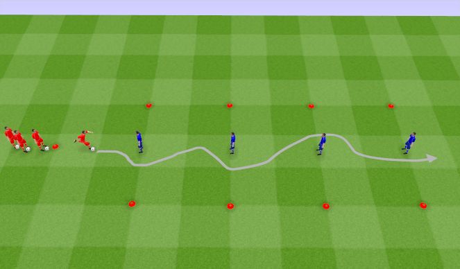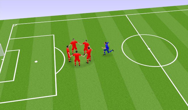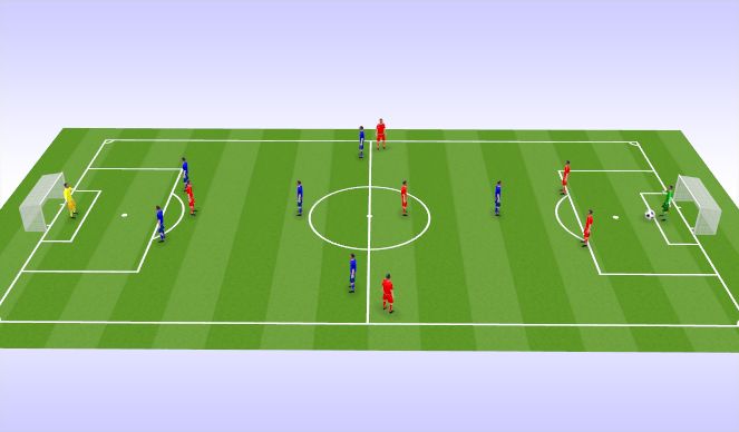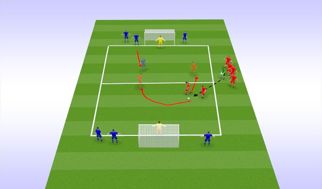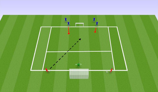 - Blues play 2v1 against the red defender to try and score in the main goal past the GK