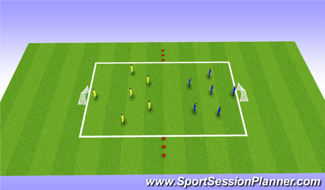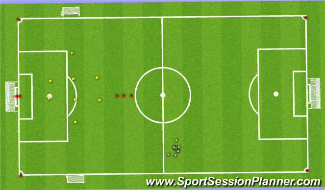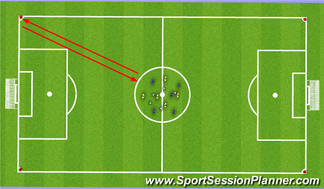 Players split into two groups, number them 1 and 2, they pass and move the ball around the centre cirlce, when the coach shouts a number they have to run to the corner flag within 15 seconds with a 45 seconds break.