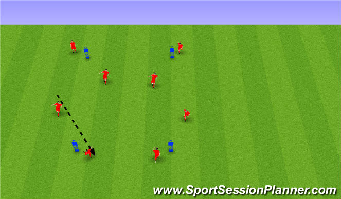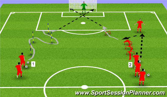 2-Pass to the high player who takes a touch while the passing player hurdles over the obstacles and then recieves the ball at the end,control and pass through the hurdle and shoot.
