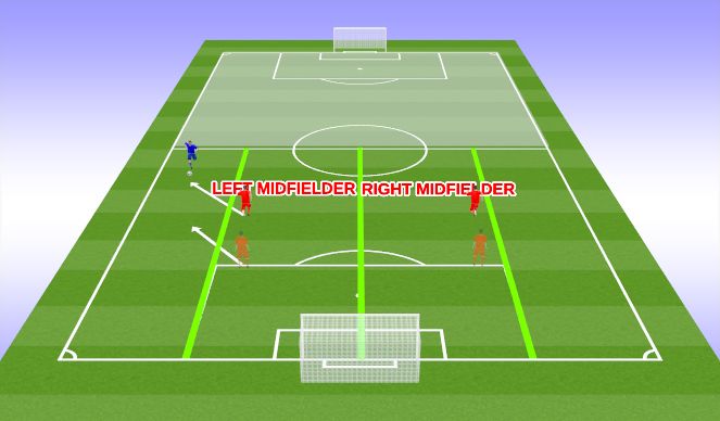 4-4-2 is historically a very popular formation in brittish football but in recent years has been less popular. When playing 4 in midfield in this formation the roles and responsibilties are very similar to that of a 4 in midfield in a 9v9 game. It is your responsibilty to get back and help the defence when your team has lost possesion. As the wide mifielder you will have a unit partnership with the same sided defender. it is important you communicate with each other to defend as a unit. The out of possesion zone is quite large as your main responsibilty will be to mark and track runs of the same sided wide midfielder or help double up the wigner your same sided defender is marking.
