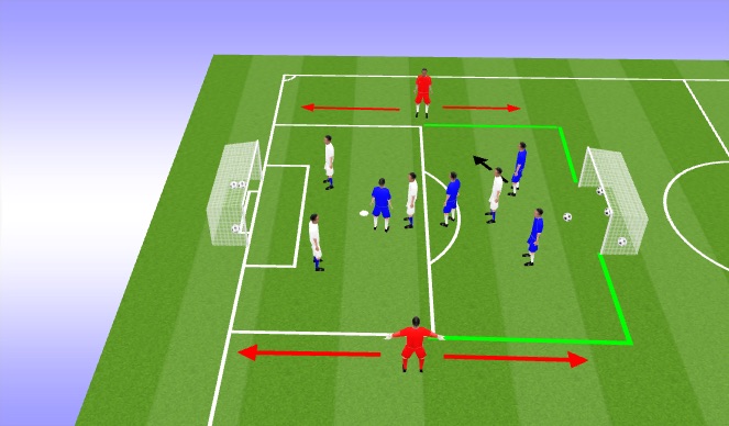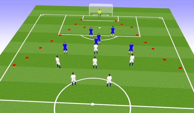 Att v Def, set up in a 2-3-1 formation. Attacking team cannot enter the coned of area. Defending tea, must try and work the ball over the halfway line. ATT team must try to score centrally.