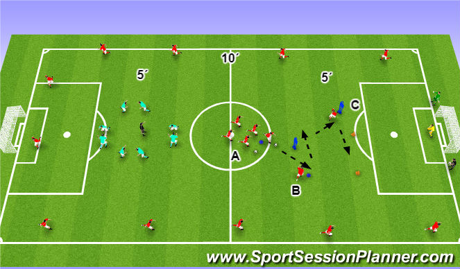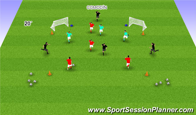 4 jugadores, simulando el posicionamiento grupal de dos centrales, un MC y un punta. Así como otro equipo de 3 jugadores en posicionamiento teórico defensivo de un central y dos laterales. También actuarán 4 comodines, uno en el interior de cuadrado, dos en los laterales del cuadrado, y un cuarto en el espacio entre miniporterias.