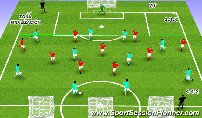 Partido condicionado 10c9+portero. El equipo con superioridad (10) atacará la portería real (sistema 4-4-2) el equipo con 9 jugadores atacará las tres miniporterías con un sistema simulado de 4-3-3 m(le faltaría un delantero).