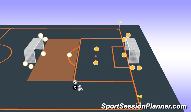 This is a continuous 2v1 game. A single defender becomes part of an attacking pair as they transition from defence to attack. Each pair of players wears a different bib colour. The player initially defending is joined by another player who is carrying the ball. They now attack the defender, who has joined from the other side of the pitch. This pattern repeats itself continuously.