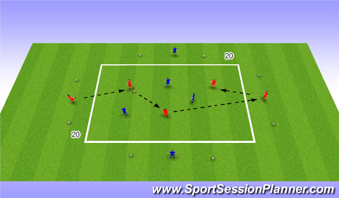 Description: Red play East vs. West. Blue north vs. south. Objective is to play from one target player to the other target player. Do this for the warm up moving from one side to the other without involving the other team. this will improve scannng as they will all be fluid in the same space working cross flow to each other. Once you pass to a player on the outside you carry out a 1-2 pass and swap the players over.Then only use 1 ball and make it competative. If the opposing team wins the ball, they then look to play between their own target players. Restarts begin with a target player for the team that did not touch it last.