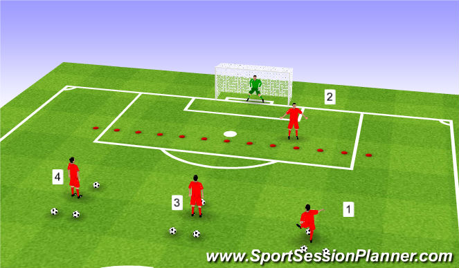 Player 1 does a 1-2 pass with player 2. HPlayer 2 Then has a big touch and heads towards goal. Player 2 is allowed then to close down player 1. Player 1 has to get his shot away before the line. Once the ball is dead or taken players 1 and 2 swap positions and the excercies then repeats between players 3 & 2 and so on. All players rotate after every go to all be involved and shoot form different positions. More players would cue behind players1,2,3 or could have 3 attackers and 3 defenders rotating stikes at goal.