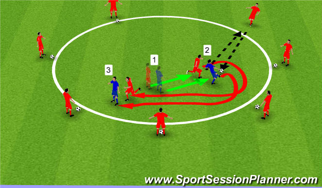 working as a pair in the middle, one player leads and the other follows. From position 1 the leader (blue) runs and calls for a ball from a feeder on the outside. When he recieves he must control and stop the ball (position 2) He then turns out and moves to another feeder for a ball and repeats (position 3). The role of the follower is to shadow bout not tackle the reciever. Once the reciever has stopped the ball dead the follower passes the ball to a feeder on the outside (position 2) then turns to follow the leader again (position 3). The leader is trying to loose the follower by working as fast as possible, changing direction and setting the pace. work for 1- 1.5mins depending on fitness then swap the pairs. Once all pairs have had a turn the leaders and followers in each pair swap roles and the practice is repeated.