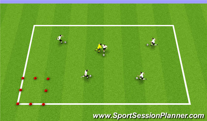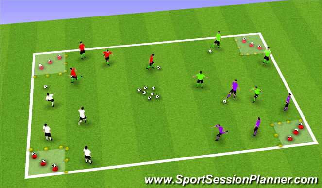 - All Players start at thier "home base". On coaches command everyone is free to get the balls in the center and start trying to knock down the other teams balls on cone.