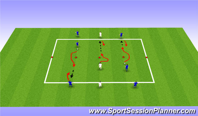 The player with the ball will dribble towards the cone, beat the cone with a move, and pass the ball to the next player in line