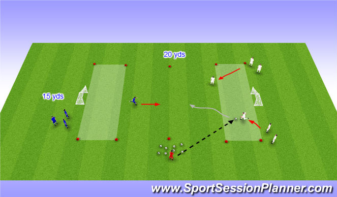 Coach sets up a 15Wx20L yard grid. Coach has all the soccer balls on the sideline. Coach divides the players into 3 groups; 2 attacking groups and 1 defending. The coach passes a soccer ball to one of the lines. The first player in each of the 3 lines enters the field. (2v1). The 2 attackers must enter the zone before shooting at goal.