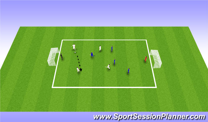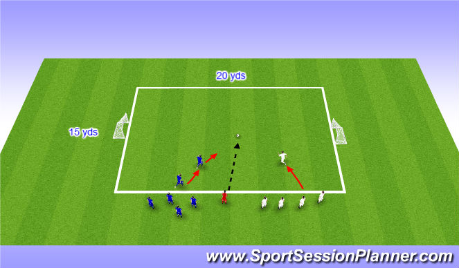 The players are divided into two teams. Players are positioned at either side of the coach, with multiple soccer balls, outside a 15Wx20L yard grid with one small goal on each end line. The coach serves a ball into the grid and the players try to gain possession and score on their opponent. If a goal is scored or the soccer ball goes out of bounds, the coach calls out “Get outta there”. Players clear the field and the coach serves a new ball for the next group. Coach: play 1v2, 2v3, or 4v3. Vary the service.