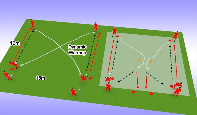 Field A: Dribble the ball into the square and then pass to the next player in line. After passing, run to the back of that line or do a dynamic movement.