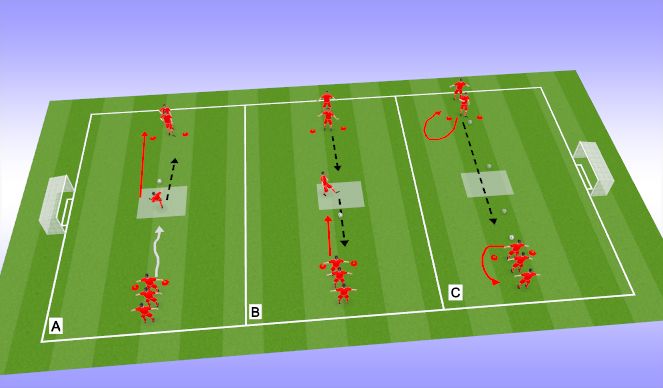 Field C: Competition Time - Teams will now compete to get the most points. Teams are made up on players on the same side. The first player will pass the ball through the box for one point and another point it it also goes through the game on other side. possible two point per pass. After passing the ball, they go to the back on the same line. 45 second challlenge