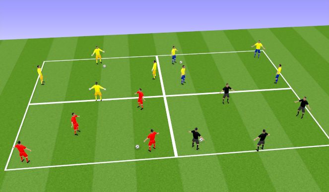 Turn the activity into a three team. Split the groups into three teams and one of the teams starts by defending while the other two teams are trying to keep possession by working together only using one ball in a large area. The team that is gives away the ball becomes the defending team and the other two teams are keeping possession working together.