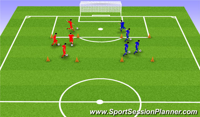 Each player is given a number, when a coach calls out their number the player must take one touch out of the grid and shoot on goal.