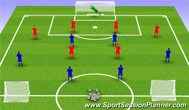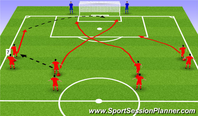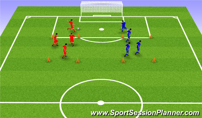Players make quick passes in their teams and on the 5th pass the player on the ball shoots on goal.