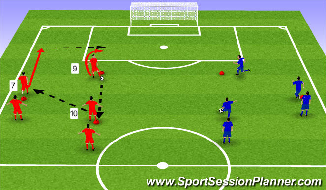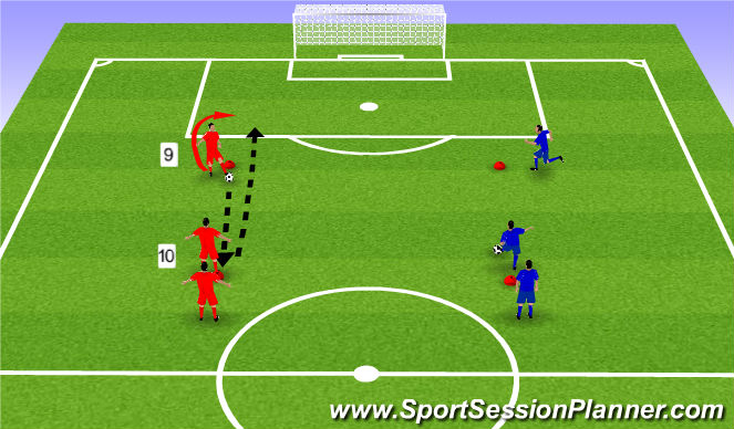 Rotation: After shooting, the striker grabs ball and joins queue. Number 10 becomes the Number 9 and the next person becomes the 10.