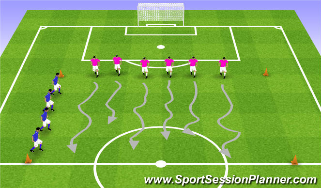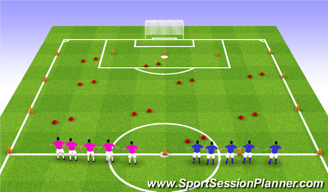 DEVELOPMENT: Two groups in adjacent sides of 10x10 yd box.One group starts by going from one side to the other, once that happens the other groups begins.The coach assigns ball mastery moves or controlling techniques to go across the grid.