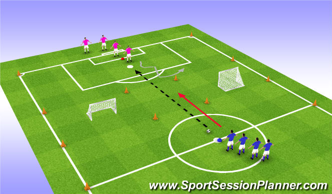 DEVELOPMENT: Two teams facing each other across two small goals facing opposite sides. The first player in team blue will play the ball forward to player in team pink. When the pass is done, that triggers a 1v1 to score in any of the two goals