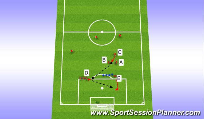 A Plays to B, B stops the ball C runs upto the ball pretending to shoot but a diagonal pass to D who the lays E who spins of the wall