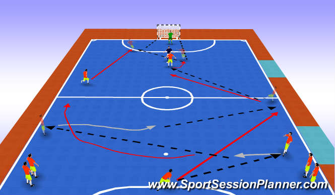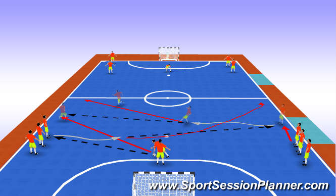 Objective: Middle players commences by selecting which winger to play a pass into. In the diagram the middle player chose the left side, play pass and make an attacking diagonal run to the side you played, Left winger receives the ball with the sole of the foot (Alligator) and rolls his first touch into to open central space to create balance in the attacking movement to play a pass into the right winger. Once the pass is played right the central player makes a diagonal attacking run to the right side of the court either overlappiing or in front of the receiving player. This decision needs to be worked out amongst the player to understand the difference between a run in front or overlapping.