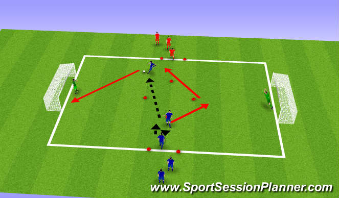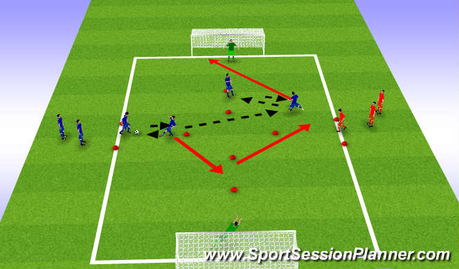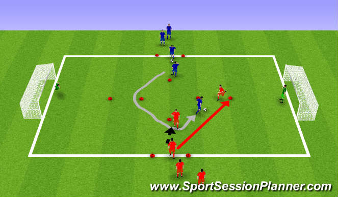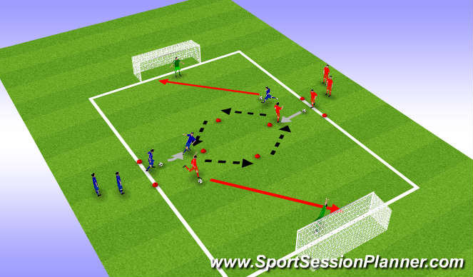 Server plays a pass to the receiver who stops the ball dead and then moves around the right side of the diamond to the opposite ball. As soon as the server initiates play with the pass they will run to the further red cone on their right side before turning and engaging in a 1v1 against the oncoming opposite attacker.