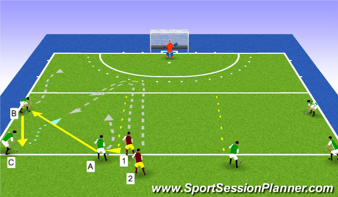 Once A receives the ball, they pass to player B, who passes to player C. Once player C receives the ball the 3v2 begins.