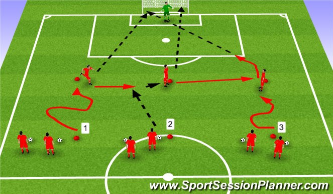 - Create 3 lines (1,2,3) of players about 30 yards from goal with a GK in each goal