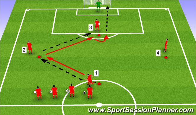- Player 3 should have a touch with their back to goal, pushing the ball around the cone before finishing on goal