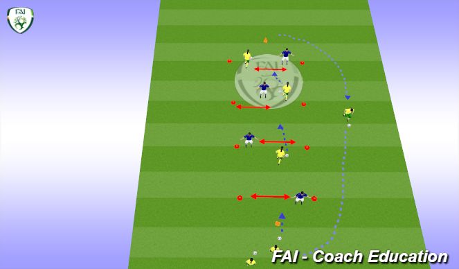 Yellow dribble through each blue line and avoid contact with blue players side-stepping