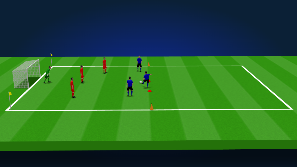 If the defending team steals the ball, it will need to take and control the ball to the 2 cones in the middle to reset the play, so the defending team starts to attack and the attacking team starts to defend.