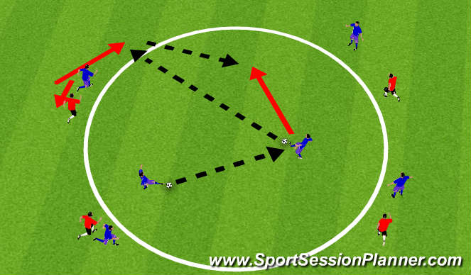 Introduce defender in middle of circle with a ball to dribble - Two players then have to pass and move around an obstacle and are encouraged to move at all times to avoid Defender