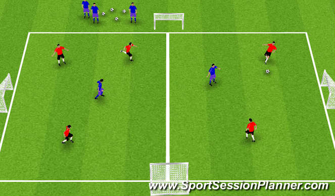 5v2 Using 4 goals, get players to use quick passing, creating space and keeping possession. They need to make 5 passes before scoring in any goal to gain a point. If defending pair win ball they can score straight away in any goal to also score a point.