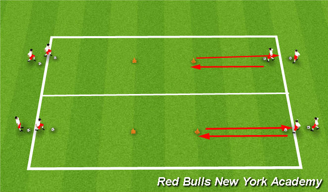 players start dribbling with small touches to the first cones, then excute the space with big touches to the red cones in the middle- excute the stop and turn move and go bak to the starting point.