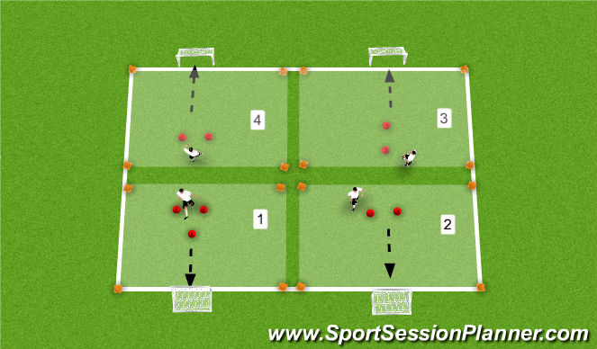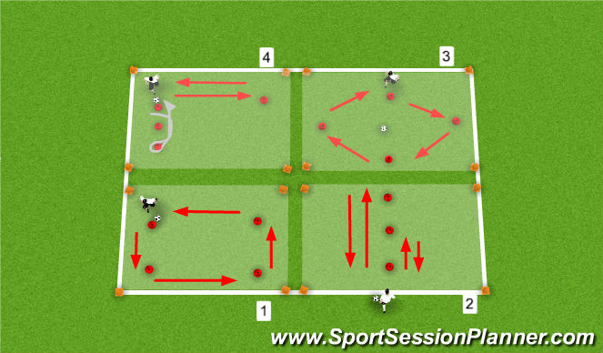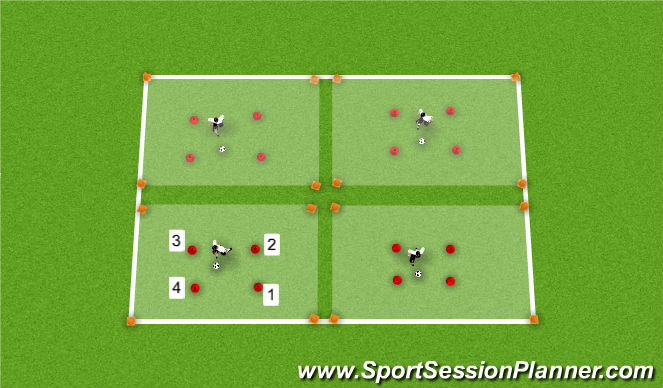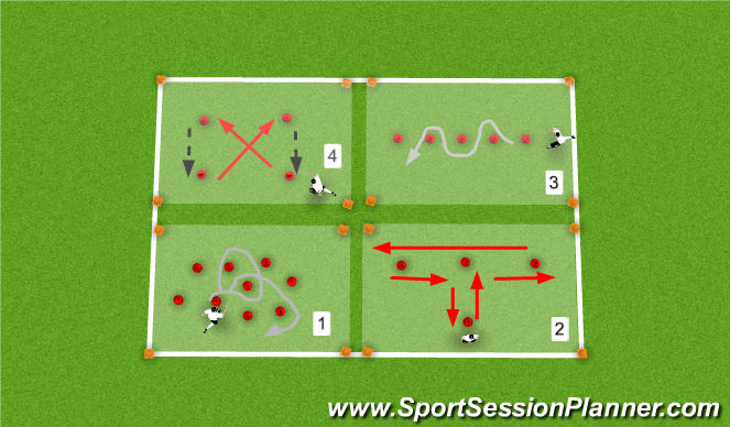 1. Player dribbles around square, once player gets back to starting position, leaves ball and sprints around square without ball.