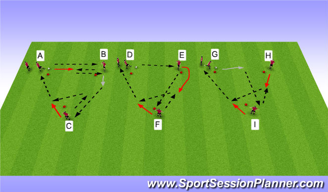 Set Up: Triangles should be between 6 - 12 yards on all sides, can start smaller and make bigger as you go, having a max of 6 players in any triangle to maximize repetition [balls, cones]