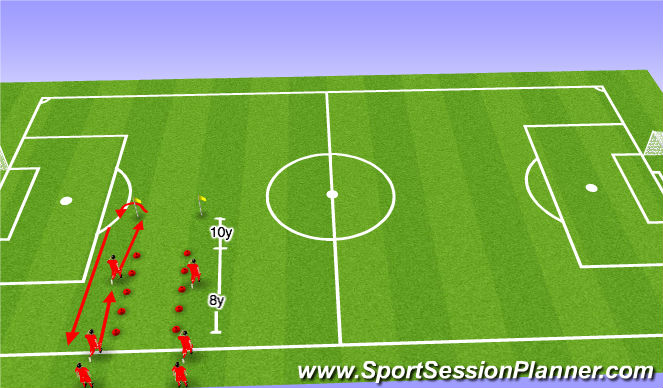 7) Facing toward one of the goals, quick feet in front of and behind the cones and 100% to flag