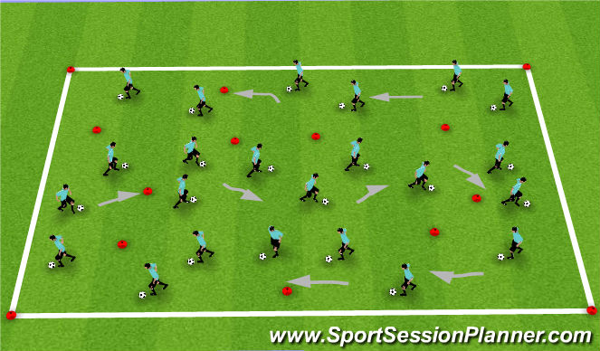 Players dribble through throughout the area to and from different pylons. Practicing ball mastery skills, 1v1 moves, and keep-ups.