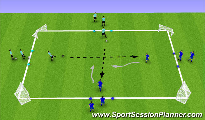 Play starts with one team passing the ball across the opposition (2 plays happening at the same time), creating 1v1 situation. Attacking player then dribbles to beat defender to score in opposite goals. If defender wins it, they transition to score in any net.