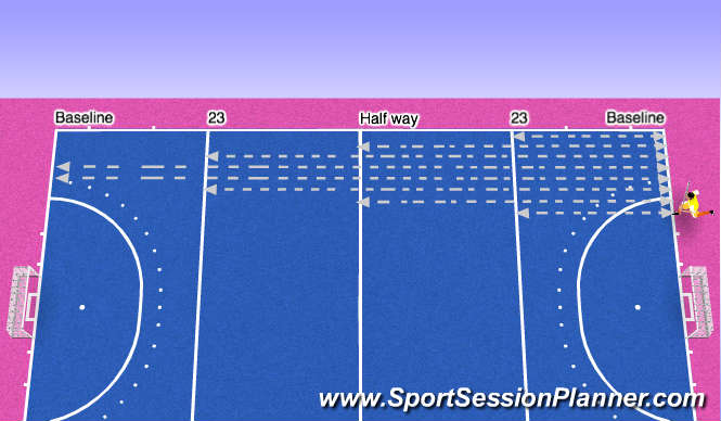 Players start on the Baseline, from there they build up running to the 23, Half way, far 23 and far Baseline, each time returning to the same start position- this a Half Winder.